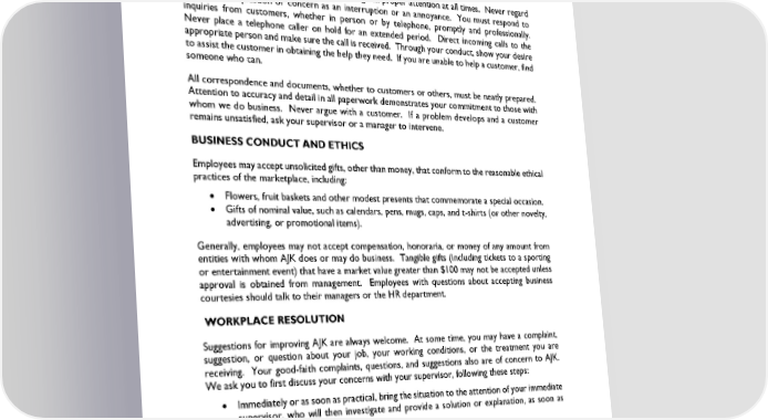 supervisor or manager should be called immediately. Ours is a service business and all of us must remember that the customer always comes first. Our customers ultimately pay all of our wages. Remember, while the customer is not always right, the customer always deserves to be treated with respect. Customers are to be treated courteously and given proper attention at all times. Never regard a customer's question or concern as an interruption or an annoyance. You must respond to inquiries from customers, whether in person or by telephone, promptly and professionally. Never place a telephone caller on hold for an extended period. Direct incoming calls to the appropriate person and make sure the call is received. Through your conduct, show your desire to assist the customer in obtaining the help they need. If you are unable to help a customer, find someone who can. All correspondence and documents, whether to customers or others, must be neatly prepared. Attention to accuracy and detail in all paperwork demonstrates your commitment to those with whom we do business. Never argue with a customer. If a problem develops and a customer remains unsatisfied, ask your supervisor or a manager to intervene. BUSINESS CONDUCT AND ETHICS Employees may accept unsolicited gifts, other than money, that conform to the reasonable ethical practices of the marketplace, including: • Flowers, fruit baskets and other modest presents that commemorate a special occasion. • Gifts of nominal value, such as calendars, pens, mugs, caps, and t-shirts (or other novelty, advertising, or promotional items). Generally, employees may not accept compensation, honoraria, or money of any amount from entities with whom AJK does or may do business. Tangible gifts (including tickets to a sporting or entertainment event) that have a market value greater than $100 may not be accepted unless approval is obtained from management. Employees with questions about accepting business courtesies should talk to their managers or the HR department. WORKPLACE RESOLUTION Suggestions for improving AJK are always welcome. At some time, you may have a complaint, suggestion, or question about your job, your working conditions, or the treatment you are receiving. Your good-faith complaints, questions, and suggestions also are of concern to AJK. We ask you to first discuss your concerns with your supervisor, following these steps: • Immediately or as soon as practical, bring the situation to the attention of your immediate supervisor, who will then investigate and provide a solution or explanation, as soon as possible. • If the problem persists, you may describe it in writing and present it to the HR manager, who will investigate and provide a solution or explanation. If you need assistance with your complaint, or you prefer to make a complaint in person, contact the HR Manager. We encourage you to bring the matter to the HR manager as soon as possible after you believe that your immediate supervisor has failed to resolve it. Revised January 2024 Page 20 of 55