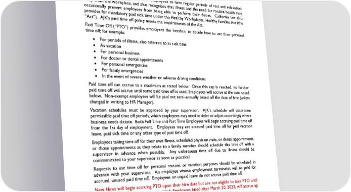 When a holiday falls on a Saturday or Sunday, it will be observed on the preceding Friday or the following Monday. To be eligible for holiday pay, you must work your regularly scheduled working days immediately preceding and immediately following the holiday. PAID TIME OFF POLICY AJK believes that it is important for employees to have regular periods of rest and relaxation away from the workplace, and also recognizes that illness and the need for routine health care occasionally prevent employees from being able to perform their duties. California law also provides for mandatory paid sick time under the Healthy Workplaces, Healthy Families Act (the “Act”). AJK's paid time off policy meets the requirements of the Act. Paid Time Off (“PTO”) provides employees the freedom to decide how to use their personal time off; for example: • For periods of illness, also referred to as sick time • As vacation • For personal business • For doctor or dental appointments • For personal emergencies • For family emergencies • In the event of severe weather or adverse driving conditions Paid time off can accrue to a maximum as stated below. Once this cap is reached, no further paid time off will accrue until some paid time off is used. Employees will accrue at the rate noted below. Non-exempt employees will be paid out semi-annually based off the date of hire (unless changed in writing to HR Manager). Vacation schedules must be approved by your supervisor. AJK’s schedule will determine permissible paid time off periods, which employees may need to defer or adjust accordingly where business needs dictate. Both Full Time and Part Time Employees will begin accruing paid time off from the 1st day of employment. Employees may use accrued paid time off for paid vacation leave, paid sick time or any other type of paid time off. Employees taking time off for their own illness, scheduled physician visits, or dental appointments or those appointments as they relate to a family member should schedule this time off with a supervisor in advance when possible. Any unforeseen time off due to illness should be communicated to your supervisor as soon as practical. Requests to use time off for personal reasons or vacation purposes should be scheduled in advance with your supervisor. An employee whose employment terminates will be paid for accrued, unused paid time off. Employees on unpaid leave do not accrue paid time off. New Hires will begin accruing PTO upon their hire date but are not eligible to take PTO until satisfying the 60-day probationary period. Employees hired after March 20, 2023, will accrue up to two weeks of PTO per year with a maximum accrual cap of 17 days. Revised January 2024 Page 38 of 55