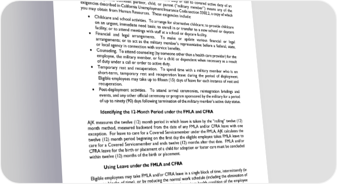 A “child” means a biological, adopted, or foster child, a stepchild, a legal ward, a child of a domestic partner, or a person to whom the employee stands in loco parentis, regardless of age. A “sibling” means a person related to another person by blood, adoption, or affinity through a common legal or biological parent. A “qualifying exigency” related to the covered active duty or call to covered active duty of an employee’s spouse, domestic partner, child, or parent (“military member”) means any of the exigencies described in California Unemployment Insurance Code section 3302.2, a copy of which you may obtain from Human Resources. These exigencies include: • Childcare and school activities. To arrange for alternative childcare; to provide childcare on an urgent, immediate need basis; to enroll in or transfer to a new school or daycare facility; or to attend meetings with staff at a school or daycare facility. • Financial and legal arrangements. To make or update various financial or legal arrangements; or to act as the military member’s representative before a federal, state, or local agency in connection with service benefits. • Counseling. To attend counseling (by someone other than a health care provider) for the employee, the military member, or for a child or dependent when necessary as a result of duty under a call or order to active duty. • Temporary rest and recuperation. To spend time with a military member who is on short-term, temporary rest and recuperation leave during the period of deployment. Eligible employees may take up to fifteen (15) days of leave for each instance of rest and recuperation. • Post-deployment activities. To attend arrival ceremonies, reintegration briefings and events, and any other official ceremony or program sponsored by the military for a period of up to ninety (90) days following termination of the military member’s active duty status. Identifying the 12-Month Period under the FMLA and CFRA AJK measures the twelve (12) month period in which leave is taken by the “rolling” twelve (12) month method, measured backward from the date of any FMLA and/or CFRA leave with one exception. For leave to care for a Covered Servicemember under the FMLA, AJK calculates the twelve (12) month period beginning on the first day the eligible employee takes FMLA leave to care for a Covered Servicemember and ends twelve (12) months after that date. FMLA and/or CFRA leave for the birth or placement of a child for adoption or foster care must be concluded within twelve (12) months of the birth or placement. Using Leave under the FMLA and CFRA Eligible employees may take FMLA and/or CFRA leave in a single block of time, intermittently (in separate blocks of time), or by reducing the normal work schedule (including the elimination of required overtime) when medically necessary for the serious health condition of the employee or immediate family member, or in the case of a Covered Servicemember under the FMLA, their injury or illness. Eligible employees may also take intermittent or reduced-schedule leave for military qualifying exigencies. Employees who require intermittent or reduced-schedule leave for planned medical treatment must make a reasonable effort to schedule their leave so that it will not unreasonably disrupt AJK’s operations. Intermittent leave, when permitted, for the birth of Revised January 2024 Page 42 of 55
