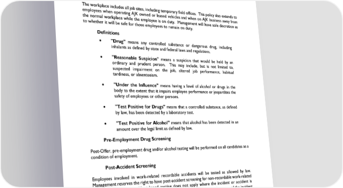 This policy has been formulated for the safety and well-being of all employees. Your assistance and cooperation for the achievement of this goal is vitally important and required as a condition of your continued employment. AJK reserves the right to change the provisions of this policy and testing program at any time. What is the "workplace"? The workplace includes all job sites, including temporary field offices. This policy also extends to employees when operating AJK owned or leased vehicles and when on AJK business away from the normal workplace while the employee is on duty. Management will have sole discretion as to whether it will be safe for those employees to remain on duty. Definitions • "Drug" means any controlled substance or dangerous drug, including inhalants as defined by state and federal laws and regulations. • "Reasonable Suspicion" means a suspicion that would be held by an ordinary and prudent person. This may include, but is not limited to, suspected impairment on the job, altered job performance, habitual tardiness, or absenteeism. • "Under the Influence" means having a level of alcohol or drugs in the body to the extent that it impairs employee performance or jeopardizes the safety of employees or other persons. • "Test Positive for Drugs" means that a controlled substance, as defined by law, has been detected by a laboratory test. • "Test Positive for Alcohol" means that alcohol has been detected in an amount over the legal limit as defined by law. Pre-Employment Drug Screening Post-Offer, pre-employment drug and/or alcohol testing will be performed on all candidates as a condition of employment. Post-Accident Screening Employees involved in work-related recordable accidents will be tested as allowed by law. Management reserves the right to have post-accident screening for non-recordable work-related accidents. Injury or accident-based testing does not apply where the incident or accident is unlikely to have occurred as a result of drug or alcohol use, or where the cause of the incident or injury is known or clear (e.g., back sprains from lifting a heavy object, bug bites that require treatment, etc.). Reasonable Suspicion Testing Revised January 2024 Page 26 of 55