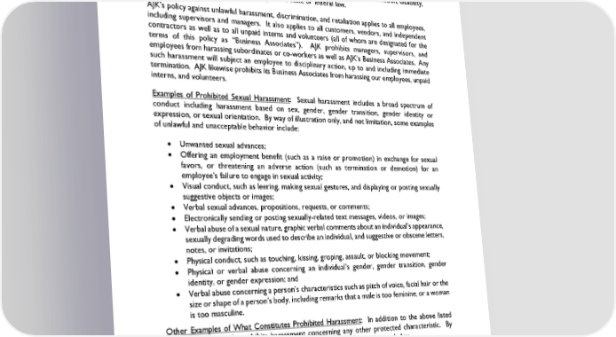 of race (including traits historically associated with race, such as hair texture and protective hairstyles, including braids, locks, and twists), ethnicity, religion, color, sex (including childbirth, breast feeding, and related medical conditions), gender, gender identity or expression, sexual orientation, national origin, ancestry, citizenship status, uniform service member and veteran status, marital status, pregnancy, age, protected medical condition, genetic information, disability, or any other category protected by applicable state or federal law. AJK’s policy against unlawful harassment, discrimination, and retaliation applies to all employees, including supervisors and managers. It also applies to all customers, vendors, and independent contractors as well as to all unpaid interns and volunteers (all of whom are designated for the terms of this policy as “Business Associates”). AJK prohibits managers, supervisors, and employees from harassing subordinates or co-workers as well as AJK’s Business Associates. Any such harassment will subject an employee to disciplinary action, up to and including immediate termination. AJK likewise prohibits its Business Associates from harassing our employees, unpaid interns, and volunteers. Examples of Prohibited Sexual Harassment: Sexual harassment includes a broad spectrum of conduct including harassment based on sex, gender, gender transition, gender identity or expression, or sexual orientation. By way of illustration only, and not limitation, some examples of unlawful and unacceptable behavior include: • Unwanted sexual advances; • Offering an employment benefit (such as a raise or promotion) in exchange for sexual favors, or threatening an adverse action (such as termination or demotion) for an employee’s failure to engage in sexual activity; • Visual conduct, such as leering, making sexual gestures, and displaying or posting sexually suggestive objects or images; • Verbal sexual advances, propositions, requests, or comments; • Electronically sending or posting sexually-related text messages, videos, or images; • Verbal abuse of a sexual nature, graphic verbal comments about an individual’s appearance, sexually degrading words used to describe an individual, and suggestive or obscene letters, notes, or invitations; • Physical conduct, such as touching, kissing, groping, assault, or blocking movement; • Physical or verbal abuse concerning an individual’s gender, gender transition, gender identity, or gender expression; and • Verbal abuse concerning a person’s characteristics such as pitch of voice, facial hair or the size or shape of a person’s body, including remarks that a male is too feminine, or a woman is too masculine. Other Examples of What Constitutes Prohibited Harassment: In addition to the above listed conduct, AJK strictly prohibits harassment concerning any other protected characteristic. By way of illustration only, and not limitation, such prohibited harassment includes: • Racial or ethnic slurs, insults, and any other offensive remarks based on a protected characteristic; • Jokes, whether written, verbal, or electronic, that are based on a protected characteristic; • Mocking or ridiculing another’s religious or cultural beliefs, practices, or manner of dress; Revised January 2024 Page 4 of 55