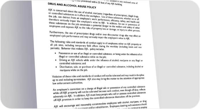 will non-employees be permitted to solicit or to distribute written material for any purpose on AJK property. TOBACCO USE The use of tobacco or any smokeless tobacco product is not allowed in any enclosed area of AJK’s property. Smoking is also prohibited within 25 feet of any AJK building. DRUG AND ALCOHOL ABUSE POLICY AJK is concerned about the use of alcohol, marijuana (regardless of prescription), illegal drugs, or controlled substances as it affects the workplace. Use of these substances, whether on or off the job, can detract from an employee’s work performance, efficiency, safety, and health and therefore seriously impair the employee’s value to AJK. In addition, the use or possession of these substances on the job constitutes a potential danger to the welfare and safety of other employees and exposes AJK to the risks of property loss or damage, or injury to other persons. Furthermore, the use of prescription drugs and/or over-the-counter drugs also may affect an employee’s job performance and may seriously impair the employee’s value to AJK. The following rules and standards of conduct apply to all employees either on AJK property or all job sites, including temporary field offices during the workday (including meals and rest periods). Behavior that violates AJK. policy includes: • Possession or use of an illegal or controlled substance, or being under the influence of an illegal or controlled substance while on the job; • Driving an AJK vehicle while under the influence of alcohol, marijuana or any illegal or controlled substance; and • Distribution, sale, or purchase of an illegal or controlled substance, including alcohol or marijuana while on the job. Violation of these rules and standards of conduct will not be tolerated and may result in discipline up to and including termination. AJK also may bring the matter to the attention of appropriate law enforcement authorities. An employee’s conviction on a charge of illegal sale or possession of any controlled substance while off AJK property will not be tolerated because such conduct, even though off duty, reflects adversely on AJK. In addition, AJK must keep people who sell or possess controlled substances off AJK premises in order to keep the controlled substances themselves off the premises. AJK will encourage and reasonably accommodate employees with alcohol, marijuana, or drug dependencies to seek treatment and/or rehabilitation. Employees desiring such assistance should request a treatment or rehabilitation leave. AJK is not obligated, however, to continue to employ any person who cannot perform essential job duties with or without reasonable accommodation because of drug, alcohol, or marijuana use. This policy on treatment and rehabilitation is not intended to affect AJK's treatment of employees who violate the regulations described previously. Revised January 2024 Page 25 of 55