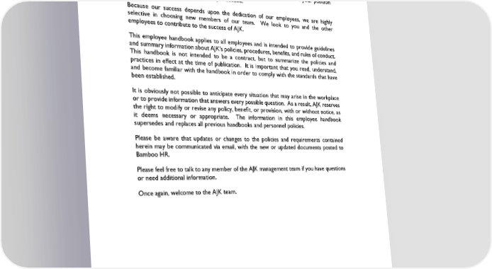 Welcome to A. J. Kirkwood & Associates, Inc. We are excited that you have made the choice to join A. J. Kirkwood & Associates, Inc. (“AJK”) and we want to help you quickly feel at home with us. As an employee AJK, you are an important member of a team effort. We know that you will find your position with AJK rewarding, challenging and productive. Because our success depends upon the dedication of our employees, we are highly selective in choosing new members of our team. We look to you and the other employees to contribute to the success of AJK. This employee handbook applies to all employees and is intended to provide guidelines and summary information about AJK's policies, procedures, benefits, and rules of conduct. This handbook is not intended to be a contract, but to summarize the policies and practices in effect at the time of publication. It is important that you read, understand, and become familiar with the handbook in order to comply with the standards that have been established. It is obviously not possible to anticipate every situation that may arise in the workplace or to provide information that answers every possible question. As a result, AJK reserves the right to modify or revise any policy, benefit, or provision, with or without notice, as it deems necessary or appropriate. The information in this employee handbook supersedes and replaces all previous handbooks and personnel policies. Please be aware that updates or changes to the policies and requirements contained herein may be communicated via email, with the new or updated documents posted to Bamboo HR. Please feel free to talk to any member of the AJK management team if you have questions or need additional information. Once again, welcome to the AJK team.