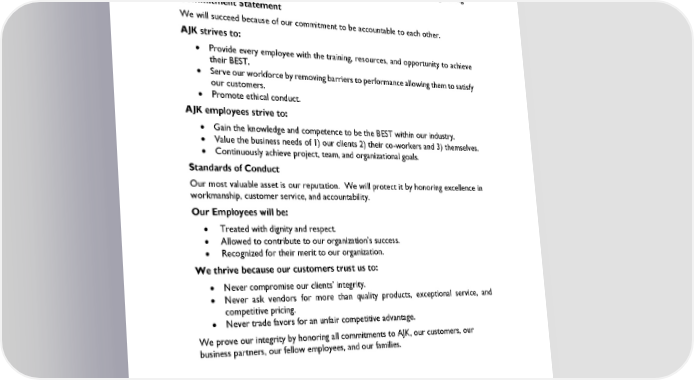 AJK Statement of Corporate Culture and Ethical Conduct Mission Statement A.J. Kirkwood and Associate’s mission is to deliver value to our clients through collaborative services, quality craftsmanship, safe work practices while utilizing cutting- edge technological platforms. Commitment Statement We will succeed because of our commitment to be accountable to each other. AJK strives to: • Provide every employee with the training, resources, and opportunity to achieve their BEST. • Serve our workforce by removing barriers to performance allowing them to satisfy our customers. • Promote ethical conduct. AJK employees strive to: • Gain the knowledge and competence to be the BEST within our industry. • Value the business needs of 1) our clients 2) their co-workers and 3) themselves. • Continuously achieve project, team, and organizational goals. Standards of Conduct Our most valuable asset is our reputation. We will protect it by honoring excellence in workmanship, customer service, and accountability. Our Employees will be: • Treated with dignity and respect. • Allowed to contribute to our organization’s success. • Recognized for their merit to our organization. We thrive because our customers trust us to: • Never compromise our clients’ integrity. • Never ask vendors for more than quality products, exceptional service, and competitive pricing. • Never trade favors for an unfair competitive advantage. We prove our integrity by honoring all commitments to AJK, our customers, our business partners, our fellow employees, and our families.