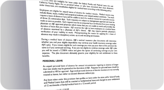 Disability insurance is payable when you cannot work because of illness or injury not caused by employment at AJK. An additional tax funds the state’s Paid Family Leave program, and provides partial wage replacement for absences related to care of a family member, or bonding with a new child. Specific rules and regulations governing disability are available from the Payroll Manager. EXTENDED MEDICAL LEAVE Employees who are ineligible for leave under the federal Family and Medical Leave Act and California Family Rights Act as provided below, or who have exceeded their leave allotment under those laws, are nonetheless eligible for medical leave according to the following policy: Employees are eligible for unpaid leaves of absence for medical reasons. Medical reasons may include illness, injury, medical and surgical procedures, and related medical conditions. You must request a leave of absence if you will be unable to work for medical reasons for a period in excess of three (3) consecutive days. Such requests are subject to management approval and must be made as soon as possible. Each request must be accompanied by a certification from your treating physician or AJK approved physician which states that you are unable to work and provides the duration of leave that you require. AJK reserves the right to have employees on a medical leave of absence examined by a physician of AJK’s choice. AJK may require periodic physician’s verification of your inability to work. Misrepresenting the reason for applying for a leave of absence may result in disciplinary action, up to and including termination. During a medical leave of absence, AJK’s medical insurance plan documents will determine whether you and your eligible dependents may continue your health insurance coverage under AJK’s plan. If you remain eligible for such coverage you must pay your share of the premium the same as if you continued working. If you are not eligible to continue coverage under AJK’s plan you will be issued a COBRA notice and given the option of continuing coverage at your own expense. The plan document ultimately governs your eligibility for and entitlement to these benefits. PERSONAL LEAVE An unpaid personal leave of absence for unusual circumstances requiring an absence of longer than two weeks may be granted at the discretion of AJK. Requests for personal leave should be submitted to HR for approval. Approved personal absences of shorter duration are not normally treated as leaves, but rather as excused absences without pay. Any leave taken under this provision that qualifies as leave under the state and/or federal Family and Medical Leave Acts will be counted as family/medical leave and charged to your entitlement of 12 workweeks of family/medical leave in a 12-month period. BEREAVEMENT LEAVE AJK grants leave of absence to employees in the event of the death of the employee’s current spouse, registered domestic partner, child, parent, legal guardian, brother, sister, grandparent, or grandchild; or mother-, father-, sister-, brother-, son-, or daughter-in-law. An employee with such a death in the family may take up to 5 scheduled workdays off without pay with the approval Revised January 2024 Page 50 of 55