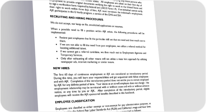 HIRING EMPLOYMENT ELIGIBILITY AJK complies with the Immigration Reform and Control Act, employing only those persons who are legally eligible to work in the United States. All employees are asked on their first day of employment to provide original documents verifying the right to work in the United States and to sign a verification form required by federal law (USCIS Form I-9). If an individual cannot verify their right to work within three days of hire, AJK must terminate the individual’s employment. AJK participates in the E-Verify program, a service of the DHS and SSA. RECRUITING AND HIRING PROCEDURES We do not accept, nor keep on file, unsolicited applications or resumes. When a possible need to fill a position within AJK arises, the following procedures will be implemented: • Review past employees that fit the particular skill set that we need and then reach out to them. • If we are not able to fill the need from past employees, we utilize a referral method for locating additional talent. • If we cannot get a referral candidate, we then reach out to Employment Agencies and Temporary Services. • Only after exhausting all other means will we utilize a mass hire approach by utilizing newspaper ads, internet marketing or similar means. NEW HIRES The first 60 days of continuous employment at AJK are considered an introductory period. During this time, you will learn your responsibilities and get acquainted with fellow employees and with AJK. Completion of the introductory period does not entitle you to remain employed by AJK for any definite period of time. Your status as an at-will employee does not change - the employment relationship may be terminated with or without cause and with or without advance notice, at any time by you or AJK. After completion of the introductory period, eligible employees will receive the AJK-sponsored benefits described in this handbook. EMPLOYEE CLASSIFICATION Employees are classified as either exempt or non-exempt for pay administration purposes, as determined by the federal Fair Labor Standards Act (FLSA) and California’s wage and hour laws. The definitions of the worker classification categories can be summarized as follows: • Exempt Employees: Management, supervisory, professional, sales or administrative employees, whose positions meet FLSA and California standards, are exempt from overtime pay requirements. Revised January 2024 Page 7 of 55