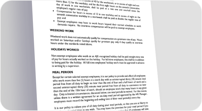 AJK provides compensation for all overtime hours worked by non-exempt employees in accordance with state and federal law as follows: • All hours worked in excess of eight hours in one workday or 40 hours in one workweek will be treated as overtime. A workday begins at 12:01 a.m. and ends at midnight 24 hours later. Workweeks begin each Monday at 12:01 a.m.; • Compensation for hours in excess of 40 for the workweek, or in excess of eight and not more than 12 for the workday, and for the first eight hours on the seventh consecutive day of work in one workweek, shall be paid at a rate one and one-half times the employee's regular rate of pay; • Compensation for hours in excess of 12 in one workday and in excess of eight on the seventh consecutive workday in a workweek shall be paid at double the regular rate of pay; and • Exempt employees may have to work hours beyond their normal schedules as work demands require. No overtime compensation will be paid to exempt employees. WEEKEND WORK Weekend work does not automatically qualify for compensation at a premium rate of pay. Hours worked on Saturdays and/or Sundays qualify for premium pay only if they qualify as overtime hours under the standards noted above. HOLIDAYS WORKED Non-exempt employees who work on an AJK-recognized holiday shall be paid straight-time rate of pay for hours actually worked on the holiday. For full-time employees, this shall be in addition to being paid for the holiday. All full-time employees' holiday work must be approved in advance in writing by a supervisor. MEAL PERIODS Except for certain salaried exempt employees, it is our policy to provide and afford all employees who work more than five (5) hours in a work day with an uninterrupted thirty (30) minute meal period free from all duty to begin no later than the end of four and a half hours of work and a second uninterrupted thirty (30) minute meal period free from all duty to commence no later than the end of the 10th hour of work, should an employee work that many hours in any given day. Only in limited circumstances, discussed below, can meal periods be waived. For this reason, unless there is a written agreement for an on-duty meal period approved by the HR Manager, employees must record the beginning and ending time of their meal period(s) every day. It is our policy to relieve you of all duty during your meal periods, so that you are at liberty to use the meal period time as you wish. You may leave the premises for your meal period if you so desire. AJK schedules all work assignments with the expectation that all employees will take their duty-free meal periods and we encourage you to do so. You may be asked to confirm in writing that you have been relieved of all duty and otherwise provided all of your meal periods during a particular pay period, or in the alternative, identify any meal periods during which you were required to work. At no time may any employee perform off-the-clock work or otherwise Revised January 2024 Page 12 of 55