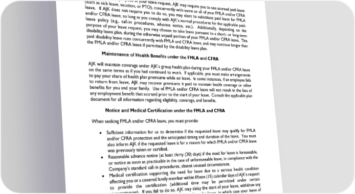 a child, to care for a newly-born child, or for placement of a child for adoption or foster care must be taken in increments of at least two (2) weeks, with shorter increments allowed on any two (2) occasions. Intermittent leave is permitted in increments of at least one (1) hour. Use of Paid Leave under the FMLA and CFRA Depending on the purpose of your leave request, AJK may require you to use accrued paid leave (such as sick leave, vacation, or PTO), concurrently with some or all of your FMLA and/or CFRA leave. If AJK does not require you to do so, you may elect to substitute paid leave for FMLA and/or CFRA leave, so long as you comply with AJK’s normal procedures for the applicable paid- leave policy (e.g., call-in procedures, advance notice, etc.). Additionally, depending on the purpose of your leave request, you may choose to take leave pursuant to a short- or long-term disability leave plan, during the otherwise unpaid portion of your FMLA and/or CFRA leave. This paid disability leave runs concurrently with FMLA and CFRA leave, and may continue longer than the FMLA and/or CFRA leave if permitted by the disability leave plan. Maintenance of Health Benefits under the FMLA and CFRA AJK will maintain coverage under AJK’s group health plan during your FMLA and/or CFRA leave on the same terms as if you had continued to work. If applicable, you must make arrangements to pay your share of health plan premiums while on leave. In some instances, if an employee fails to return from leave, AJK may recover premiums it paid to maintain health coverage or other benefits for you and your family. Use of FMLA and/or CFRA leave will not result in the loss of any employment benefit that accrued prior to the start of your leave. Consult the applicable plan document for all information regarding eligibility, coverage, and benefits. Notice and Medical Certification under the FMLA and CFRA When seeking FMLA and/or CFRA leave, you must provide: • Sufficient information for us to determine if the requested leave may qualify for FMLA and/or CFRA protection and the anticipated timing and duration of the leave. You must also inform AJK if the requested leave is for a reason for which FMLA and/or CFRA leave was previously taken or certified. • Reasonable advance notice (at least thirty (30) days) if the need for leave is foreseeable, or notice as soon as practicable in the case of unforeseeable leave, in compliance with the Company’s standard call-in procedures, absent unusual circumstances. • Medical certification supporting the need for leave due to a serious health condition affecting you or a covered family member within fifteen (15) calendar days of AJK’s request to provide the certification (additional time may be permitted under certain circumstances). If you fail to do so, AJK may delay the start of your leave, withdraw any designation of FMLA and/or CFRA leave or deny the leave, in which case your leave of absence would be treated in accordance with our standard leave of absence and attendance policies. Second or third medical opinions and periodic re-certifications may also be required. • Appropriate documentation, within fifteen (15) days of the Company’s request (additional time may be permitted under certain circumstances), supporting the need for leave due Revised January 2024 Page 43 of 55
