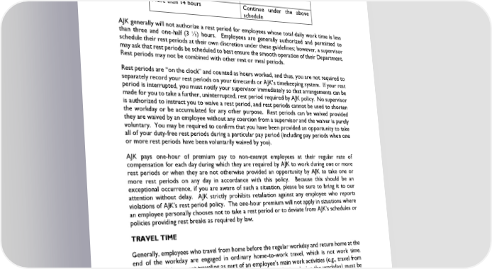 Shift (Hours Worked in Day) Number of Paid Rest Breaks At least 3.5 and up to 6 hours 1 More than 6 and up to 10 hours 2 More than 10 and up to 14 hours 3 More than 14 hours Continue under the above schedule AJK generally will not authorize a rest period for employees whose total daily work time is less than three and one-half (3 ½) hours. Employees are generally authorized and permitted to schedule their rest periods at their own discretion under these guidelines; however, a supervisor may ask that rest periods be scheduled to best ensure the smooth operation of their Department. Rest periods may not be combined with other rest or meal periods. Rest periods are “on the clock” and counted as hours worked, and thus, you are not required to separately record your rest periods on your timecards or AJK’s timekeeping system. If your rest period is interrupted, you must notify your supervisor immediately so that arrangements can be made for you to take a further, uninterrupted, rest period required by AJK policy. No supervisor is authorized to instruct you to waive a rest period, and rest periods cannot be used to shorten the workday or be accumulated for any other purpose. Rest periods can be waived provided they are waived by an employee without any coercion from a supervisor and the waiver is purely voluntary. You may be required to confirm that you have been provided an opportunity to take all of your duty-free rest periods during a particular pay period (including pay periods when one or more rest periods have been voluntarily waived by you). AJK pays one-hour of premium pay to non-exempt employees at their regular rate of compensation for each day during which they are required by AJK to work during one or more rest periods or when they are not otherwise provided an opportunity by AJK to take one or more rest periods on any day in accordance with this policy. Because this should be an exceptional occurrence, if you are aware of such a situation, please be sure to bring it to our attention without delay. AJK strictly prohibits retaliation against any employee who reports violations of AJK’s rest period policy. The one-hour premium will not apply in situations where an employee personally chooses not to take a rest period or to deviate from AJK’s schedules or policies providing rest breaks as required by law. TRAVEL TIME Generally, employees who travel from home before the regular workday and return home at the end of the workday are engaged in ordinary home-to-work travel, which is not work time. However, all time spent traveling as part of an employee's main work activities (e.g., travel from one job site to another, or from the work location to a job site, during the workday) must be counted as hours worked and recorded on the employee's time sheet. Where an employee's job involves traveling from one site to another after reporting for the day's work, the travel time must be counted as hours worked. Travel time that occurs in addition to Revised January 2024 Page 14 of 55