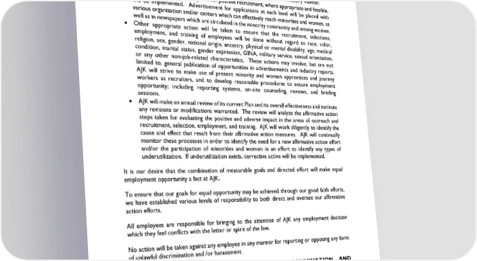 • Ensuring that promotion decisions are in accordance with equal employment opportunity requirements by imposing only valid, job-related requirements for promotional opportunities. • Ensuring that all personnel actions relating to compensation, benefits, transfers, termination, training, and education are administered in a nondiscriminatory manner. • Ensuring that outreach programs for positive recruitment, where appropriate and feasible, will be implemented. Advertisement for applications at each level will be placed with various organization and/or centers which can effectively reach minorities and women, as well as in newspapers which are circulated in the minority community and among women. • Other appropriate action will be taken to ensure that the recruitment, selections, employment, and training of employees will be done without regard to race, color, religion, sex, gender, national origin, ancestry, physical or mental disability, age, medical condition, marital status, gender expression, GINA, military service, sexual orientation, or any other non-job-related characteristics. These actions may involve, but are not limited to, general publication of opportunities in advertisements and industry reports. AJK will strive to make use of present minority and women apprentices and journey workers as recruiters, and to develop reasonable procedures to ensure employment opportunity; including reporting systems, on-site counseling, reviews, and briefing sessions. • AJK will make an annual review of its current Plan and its overall effectiveness and institute any revisions or modifications warranted. The review will analyze the affirmative action steps taken for evaluating the positive and adverse impact in the areas of outreach and recruitment, selection, employment, and training. AJK will work diligently to identify the cause and effect that result from their affirmative action measures. AJK will continually monitor these processes in order to identify the need for a new affirmative action effort and/or the participation of minorities and women in an effort to identify any types of underutilization. If underutilization exists, corrective active will be implemented. It is our desire that the combination of measurable goals and directed effort will make equal employment opportunity a fact at AJK. To ensure that our goals for equal opportunity may be achieved through our good faith efforts, we have established various levels of responsibility to both direct and oversee our affirmative action efforts. All employees are responsible for bringing to the attention of AJK any employment decision which they feel conflicts with the letter or spirit of the law. No action will be taken against any employee in any manner for reporting or opposing any form of unlawful discrimination and /or harassment. POLICY AGAINST UNLAWFUL HARASSMENT, DISCRIMINATION, AND RETALIATION AJK is committed to providing a work environment that is free of unlawful harassment, discrimination, and retaliation. In furtherance of this commitment, AJK strictly prohibits all forms of unlawful discrimination and harassment, including: discrimination or harassment on the basis Revised January 2024 Page 3 of 55