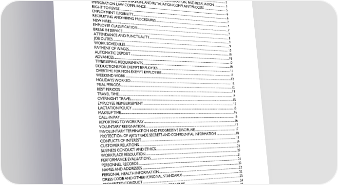TABLE OF CONTENTS AT-WILL EMPLOYMENT STATUS ........................................................................................................................ 1 EQUAL EMPLOYMENT OPPORTUNITY STATEMENT ................................................................................... 1 AFFIRMATIVE ACTION POLICY ........................................................................................................................... 2 POLICY AGAINST UNLAWFUL HARASSMENT, DISCRIMINATION, AND RETALIATION ................. 3 HARASSMENT, DISCRIMINATION, AND RETALIATION COMPLAINT PROCESS ................................. 5 IMMIGRATION LAW COMPLIANCE ................................................................................................................... 6 RIGHT TO REVISE ..................................................................................................................................................... 6 EMPLOYMENT ELIGIBILITY .................................................................................................................................... 7 RECRUITING AND HIRING PROCEDURES ....................................................................................................... 7 NEW HIRES ................................................................................................................................................................. 7 EMPLOYEE CLASSIFICATION................................................................................................................................ 7 BREAK IN SERVICE ................................................................................................................................................... 8 ATTENDANCE AND PUNCTUALITY ................................................................................................................. 9 JOB DUTIES ................................................................................................................................................................ 9 WORK SCHEDULES ............................................................................................................................................... 10 PAYMENT OF WAGES........................................................................................................................................... 10 AUTOMATIC DEPOSIT ......................................................................................................................................... 10 ADVANCES .............................................................................................................................................................. 10 TIMEKEEPING REQUIREMENTS .......................................................................................................................... 10 DEDUCTIONS FOR EXEMPT EMPLOYEES ....................................................................................................... 11 OVERTIME FOR NON-EXEMPT EMPLOYEES .................................................................................................. 11 WEEKEND WORK ................................................................................................................................................. 12 HOLIDAYS WORKED............................................................................................................................................ 12 MEAL PERIODS ........................................................................................................................................................ 12 REST PERIODS ......................................................................................................................................................... 13 TRAVEL TIME ........................................................................................................................................................... 14 OVERNIGHT TRAVEL ............................................................................................................................................ 15 EMPLOYEE REIMBURSEMENT ............................................................................................................................. 15 LACTATION POLICY ............................................................................................................................................ 15 MAKEUP TIME .......................................................................................................................................................... 16 CALL-IN PAY ............................................................................................................................................................ 16 REPORTING TO WORK PAY .............................................................................................................................. 16 VOLUNTARY RESIGNATION ............................................................................................................................. 17 INVOLUNTARY TERMINATION AND PROGRESSIVE DISCIPLINE .......................................................... 17 PROTECTION OF AJK’S TRADE SECRETS AND CONFIDENTIAL INFORMATION ............................ 18 CONFLICTS OF INTEREST ................................................................................................................................... 19 CUSTOMER RELATIONS ...................................................................................................................................... 19 BUSINESS CONDUCT AND ETHICS ................................................................................................................. 20 WORKPLACE RESOLUTION ............................................................................................................................... 20 PERFORMANCE EVALUATIONS ............................................................................