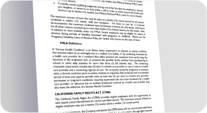 • To care for an immediate family member (employee’s spouse, child, or parent) with a serious health condition (up to twelve (12) weeks). • Because of an employee’s serious health condition that makes the employee unable to perform the functions of the employee’s position (up to twelve (12) weeks). • To care for a Covered Servicemember with a serious injury or illness related to certain types of military service (up to twenty-six (26) weeks) (see Military-Related FMLA Leave for more details). • To handle certain qualifying exigencies arising out of the fact that the employee’s spouse, son, daughter, or parent is on duty under a call or order to active duty in the Uniformed Services (up to twelve (12) weeks) (see Military-Related FMLA Leave for more details). The maximum amount of leave that may be taken in a twelve (12) month period for all reasons combined is twelve (12) weeks, with one exception. For leave to care for a Covered Servicemember, the maximum combined leave entitlement is twenty-six (26) weeks, with leaves for all other reasons constituting no more than twelve (12) of those twenty-six (26) weeks. Also, in addition to leave available under the FMLA, female employees may be eligible for leaves of absence during periods of disability associated with pregnancy or childbirth. Please see the Pregnancy Disability Leave of Absence Policy for further information on this type of leave. FMLA Definitions A “Serious Health Condition” is an illness, injury, impairment, or physical or mental condition that involves either (i) an overnight stay in a medical care facility, or (ii) continuing treatment by a health care provider for a condition that either prevents the employee from performing the functions of the employee’s job, or prevents the qualified family member from participating in school or other daily activities for more than three (3) full calendar days. The continuing treatment requirement includes two (2) visits to a health care provider or one (1) visit to a health care provider and a continuing regimen of care. An incapacity caused by pregnancy or prenatal visits, a chronic condition (such as asthma, diabetes or migraines) that continues over an extended period of time and requires periodic visits (at least two (2) per year) to a health care provider, permanent or long-term conditions requiring supervision but not active treatment by a health care provider, or absences due to multiple treatments ordered by a health care provider may also meet the definition of a Serious Health Condition. CALIFORNIA FAMILY RIGHTS ACT (CFRA) The California Family Rights Act (CFRA) provides eligible employees with the opportunity to take unpaid, job-protected leave for certain specified reasons. The maximum amount of leave an eligible employee may use is twelve (12) weeks within a twelve (12) month period. In most circumstances, the Company anticipates that CFRA leave will run concurrently with leave under the federal Family and Medical Leave Act (“FMLA”). In such case(s), the aggregate amount of CFRA leave and/or FMLA leave shall not exceed twelve (12) workweeks in a twelve (12) month period. However, under the following circumstances, CFRA leave will not run concurrently with FMLA leave: Revised January 2024 Page 40 of 55