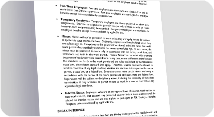 • Non-exempt Employees: Employees whose positions do not meet the FLSA and California exemption standards are paid overtime according to state and federal law. • Full-Time Employees: Full-time employees are those who are scheduled for and do work 30 hours or more per week. Following the completion of the introductory period, regularly scheduled full-time employees are eligible for the employee benefits described in this handbook. • Part-Time Employees: Part-time employees are those who are scheduled for and do work fewer than 30 hours per week. Part-time employees are not eligible for employee benefits except those mandated by applicable law. • Temporary Employees: Temporary employees are those employed for short-term assignments. Short-term assignments generally are periods of three months or fewer; however, such assignments may be extended. Temporary employees are not eligible for employee benefits except those mandated by applicable law. • Minors: Minors will not be permitted to work unless they are legally able to do so under all applicable state and federal laws. Ordinarily, employees will not be hired unless they are at least age 18. Exceptions to this policy will be allowed only if the minor has a valid work permit that specifically authorizes the minor to work for AJK. In such a case, the minor may be permitted to work only in accordance with the terms, restrictions, and limitations set forth in the work permit. Human Resources can assist with providing department heads with work permit forms. In any case, where a difference exists between the standards set forth in the work permit and the rules established by the federal and state laws, the strictest standard shall apply. Therefore, a minor may not be allowed to work in violation of any legal standard, whether the standard is incorporated in a work permit, a state law, or a federal law. Supervisors must make certain minors work only in accordance with the terms of the work permit and applicable state and federal laws. Supervisors will be subject to disciplinary action, including the possibility of immediate termination, if they schedule or permit minors to work in a manner that violates any applicable legal standards. • Inactive Status: Employees who are on any type of leave of absence, work-related or non-work-related, that exceeds any protected state or federal leave of absence will be placed on inactive status and are not eligible to participate in AJK Employee Benefits Program, unless mandated by applicable law. BREAK IN SERVICE Employees whose break in service is less than the 60-day waiting period for health benefits will be reinstated into the health benefit plan in which they were enrolled prior to their termination pursuant to the terms and conditions of the particular benefit programs. Employees who have a break in service longer than 60 days must meet eligibility requirements for all benefits. Revised January 2024 Page 8 of 55