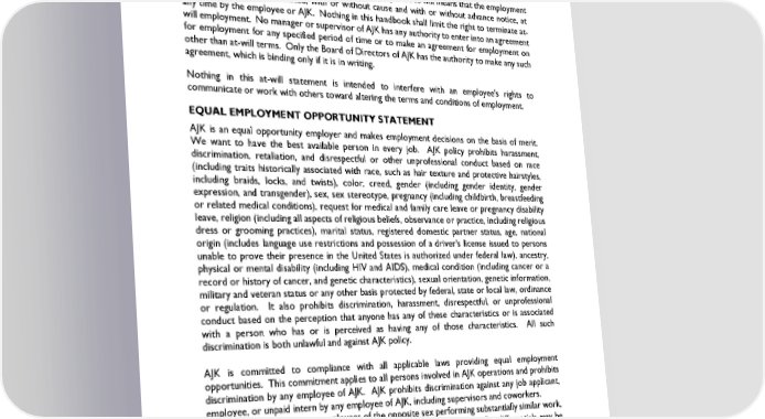 EMPLOYMENT POLICIES AT-WILL EMPLOYMENT STATUS AJK employees are employed on an at-will basis. Employment at-will means that the employment relationship may be terminated, with or without cause and with or without advance notice, at any time by the employee or AJK. Nothing in this handbook shall limit the right to terminate at- will employment. No manager or supervisor of AJK has any authority to enter into an agreement for employment for any specified period of time or to make an agreement for employment on other than at-will terms. Only the Board of Directors of AJK has the authority to make any such agreement, which is binding only if it is in writing. Nothing in this at-will statement is intended to interfere with an employee's rights to communicate or work with others toward altering the terms and conditions of employment. EQUAL EMPLOYMENT OPPORTUNITY STATEMENT AJK is an equal opportunity employer and makes employment decisions on the basis of merit. We want to have the best available person in every job. AJK policy prohibits harassment, discrimination, retaliation, and disrespectful or other unprofessional conduct based on race (including traits historically associated with race, such as hair texture and protective hairstyles, including braids, locks, and twists), color, creed, gender (including gender identity, gender expression, and transgender), sex, sex stereotype, pregnancy (including childbirth, breastfeeding or related medical conditions), request for medical and family care leave or pregnancy disability leave, religion (including all aspects of religious beliefs, observance or practice, including religious dress or grooming practices), marital status, registered domestic partner status, age, national origin (includes language use restrictions and possession of a driver's license issued to persons unable to prove their presence in the United States is authorized under federal law), ancestry, physical or mental disability (including HIV and AIDS), medical condition (including cancer or a record or history of cancer, and genetic characteristics), sexual orientation, genetic information, military and veteran status or any other basis protected by federal, state or local law, ordinance or regulation. It also prohibits discrimination, harassment, disrespectful, or unprofessional conduct based on the perception that anyone has any of these characteristics or is associated with a person who has or is perceived as having any of those characteristics. All such discrimination is both unlawful and against AJK policy. AJK is committed to compliance with all applicable laws providing equal employment opportunities. This commitment applies to all persons involved in AJK operations and prohibits discrimination by any employee of AJK. AJK prohibits discrimination against any job applicant, employee, or unpaid intern by any employee of AJK, including supervisors and coworkers. Pay discrimination between employees of the opposite sex performing substantially similar work, as defined by the California Fair Pay Act and federal law, is prohibited. Pay differentials may be valid in certain situations defined by law. Employees will not be retaliated against for inquiring about or discussing wages. However, AJK is not obligated to disclose the wages of other employees. Revised January 2024 Page 1 of 55