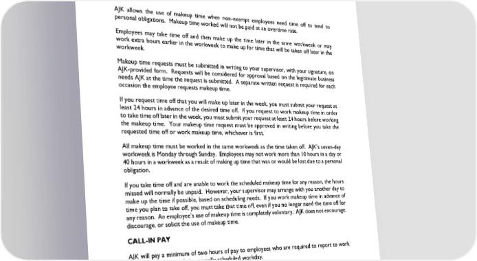 work area, shielded from view, free from intrusion while the employee is expressing milk, and has the other elements described above. Employees have the right to file a complaint with the California Labor Commissioner for any failure by AJK to provide appropriate lactation accommodations. MAKEUP TIME AJK allows the use of makeup time when non-exempt employees need time off to tend to personal obligations. Makeup time worked will not be paid at an overtime rate. Employees may take time off and then make up the time later in the same workweek or may work extra hours earlier in the workweek to make up for time that will be taken off later in the workweek. Makeup time requests must be submitted in writing to your supervisor, with your signature, on AJK-provided form. Requests will be considered for approval based on the legitimate business needs AJK at the time the request is submitted. A separate written request is required for each occasion the employee requests makeup time. If you request time off that you will make up later in the week, you must submit your request at least 24 hours in advance of the desired time off. If you request to work makeup time in order to take time off later in the week, you must submit your request at least 24 hours before working the makeup time. Your makeup time request must be approved in writing before you take the requested time off or work makeup time, whichever is first. All makeup time must be worked in the same workweek as the time taken off. AJK’s seven-day workweek is Monday through Sunday. Employees may not work more than 10 hours in a day or 40 hours in a workweek as a result of making up time that was or would be lost due to a personal obligation. If you take time off and are unable to work the scheduled makeup time for any reason, the hours missed will normally be unpaid. However, your supervisor may arrange with you another day to make up the time if possible, based on scheduling needs. If you work makeup time in advance of time you plan to take off, you must take that time off, even if you no longer need the time off for any reason. An employee’s use of makeup time is completely voluntary. AJK does not encourage, discourage, or solicit the use of makeup time. CALL-IN PAY AJK will pay a minimum of two hours of pay to employees who are required to report to work on a day other than their normally scheduled workday. REPORTING TO WORK PAY AJK will comply with all applicable regulations regarding reporting time pay for non-exempt employees. AJK will not pay employees for reporting under the following circumstances: Revised January 2024 Page 16 of 55