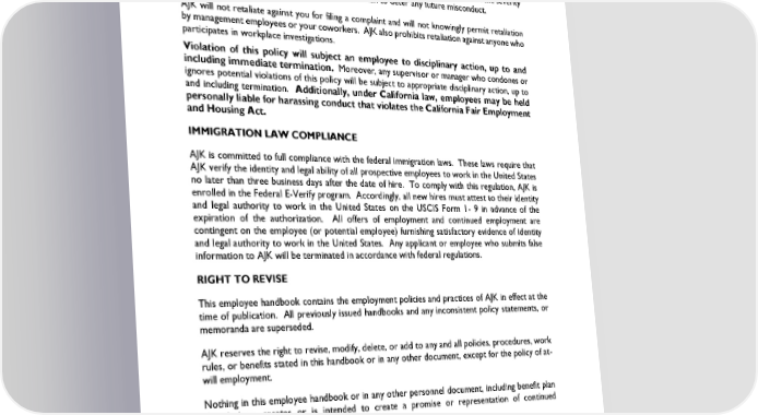 Any complaint will remain confidential, to the extent possible, and will be monitored to ensure reasonable progress and timely closures. If AJK determines that harassment, discrimination, retaliation, or other prohibited conduct has occurred, appropriate and effective remedial action will be taken commensurate with the severity of the offense. Appropriate action also will be taken to deter any future misconduct. AJK will not retaliate against you for filing a complaint and will not knowingly permit retaliation by management employees or your coworkers. AJK also prohibits retaliation against anyone who participates in workplace investigations. Violation of this policy will subject an employee to disciplinary action, up to and including immediate termination. Moreover, any supervisor or manager who condones or ignores potential violations of this policy will be subject to appropriate disciplinary action, up to and including termination. Additionally, under California law, employees may be held personally liable for harassing conduct that violates the California Fair Employment and Housing Act. IMMIGRATION LAW COMPLIANCE AJK is committed to full compliance with the federal immigration laws. These laws require that AJK verify the identity and legal ability of all prospective employees to work in the United States no later than three business days after the date of hire. To comply with this regulation, AJK is enrolled in the Federal E-Verify program. Accordingly, all new hires must attest to their identity and legal authority to work in the United States on the USCIS Form 1- 9 in advance of the expiration of the authorization. All offers of employment and continued employment are contingent on the employee (or potential employee) furnishing satisfactory evidence of identity and legal authority to work in the United States. Any applicant or employee who submits false information to AJK will be terminated in accordance with federal regulations. RIGHT TO REVISE This employee handbook contains the employment policies and practices of AJK in effect at the time of publication. All previously issued handbooks and any inconsistent policy statements, or memoranda are superseded. AJK reserves the right to revise, modify, delete, or add to any and all policies, procedures, work rules, or benefits stated in this handbook or in any other document, except for the policy of at- will employment. Nothing in this employee handbook or in any other personnel document, including benefit plan descriptions, creates or is intended to create a promise or representation of continued employment for any employee. Revised January 2024 Page 6 of 55